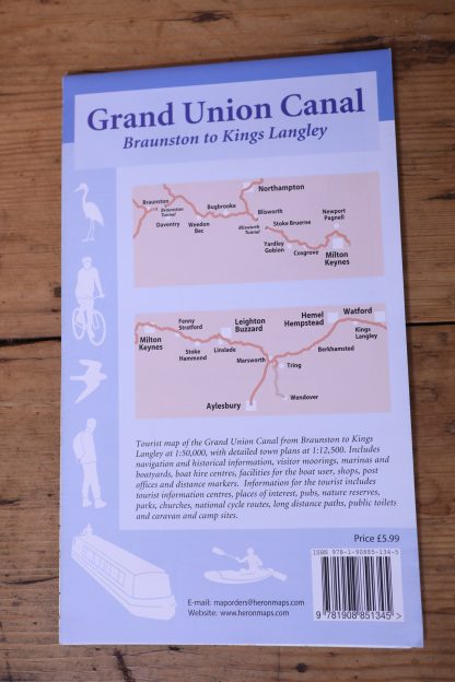 This tourist map of the Grand Union Canal from Braunston to Kings Langley at 1:50,000, with detailed town plans of Braunston, Weedon Bec, Stoke Bruerne, Northampton, Milton Keynes, Fenny Stratford, Aylesbury, Marsworth and Berkhamsted at 1:12,500.